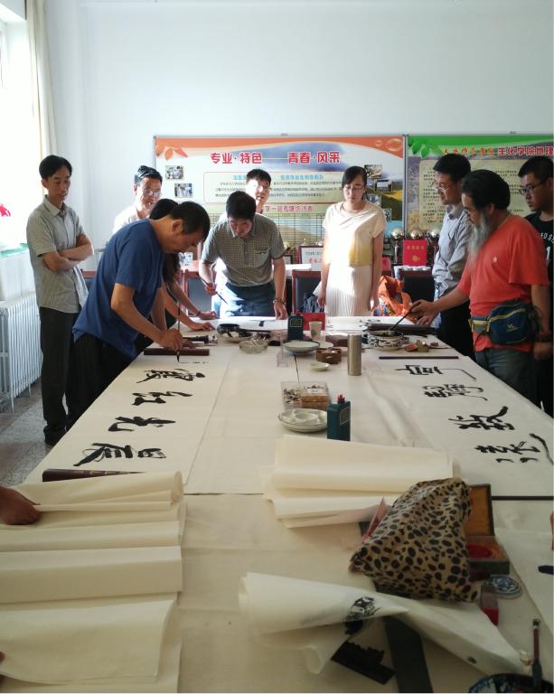 讲座结束后赵万顺先生、美术学院副院长杨皓教授、以及天水师范学院诗书画协会部分成员在beat365在线唯一官网登录会议室进行了书画笔会交流活动,在活动现场,为了弘扬我国悠久的历史文化,让更多学生得到艺术的熏陶,书画家们现场挥毫泼墨,以精湛的技艺尽展书画艺术魅力,并将现场创作的作品赠予参加活动的同学们。