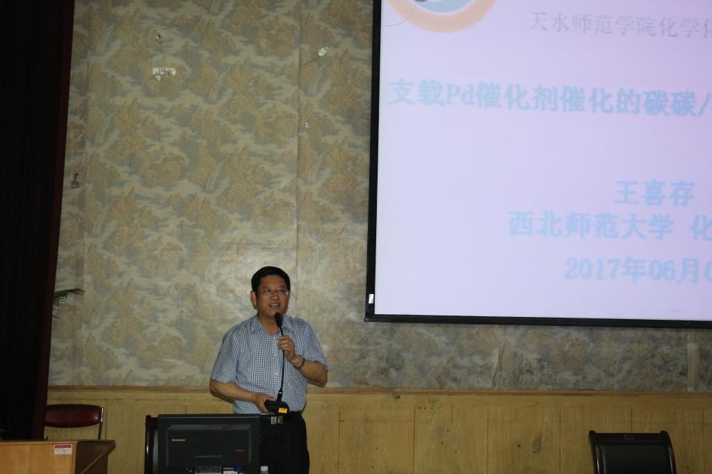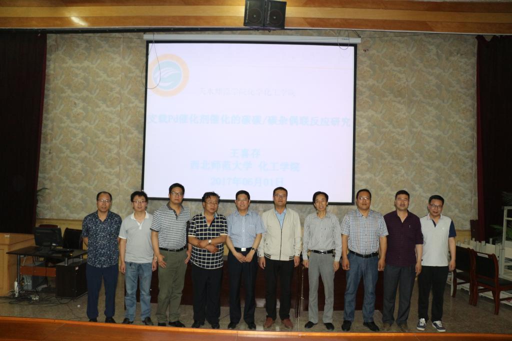 6月1日晚,在1号报告厅,西北师范大学博士生导师王喜存教授,为beat365师生做了题为“关于支载Pd催化剂催化的碳碳/碳杂偶联反应研究”的学术报告,报告会由beat365副院长吕玲玲博士主持,研究生处左国防处长、beat365在线唯一官网登录党总支书记王小芳、院长刘新文,副书记雷新有、副院长杨富巍、吕玲玲及部分教师及学生大约200余人聆听了报告。