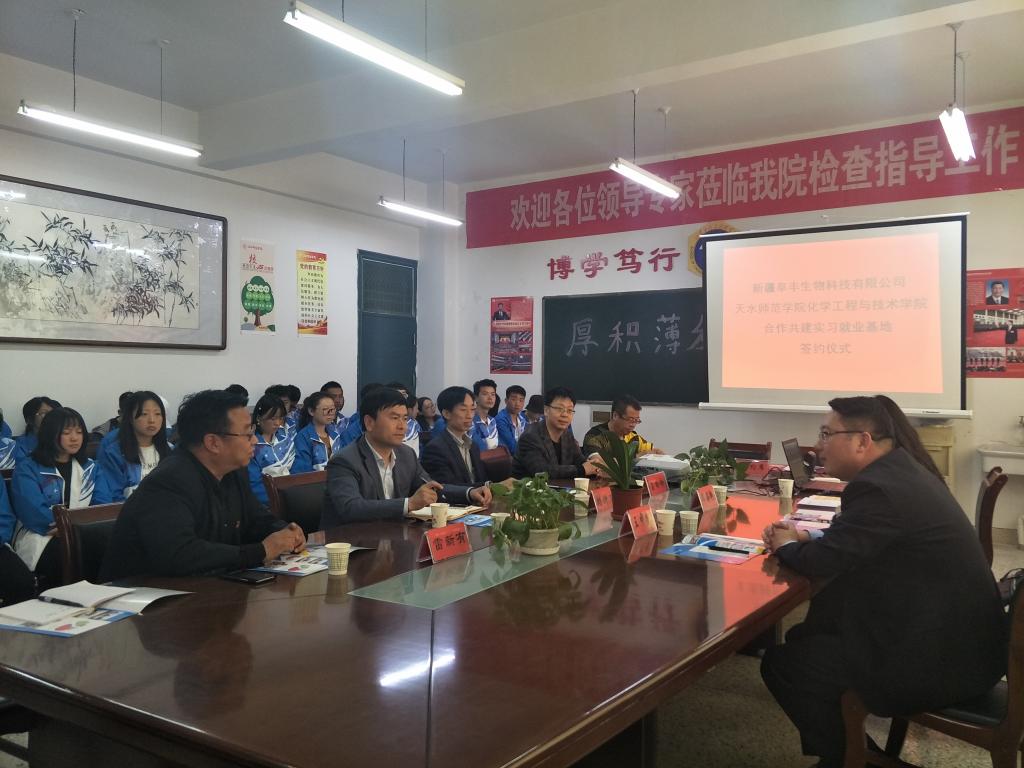 新疆阜丰生物科技有限公司人力资源部副总经理王中凯、天水师范学院招生就业处处长雒曲波、beat365在线唯一官网登录院长刘新文、副院长吕玲玲、阜丰人力资源部部长邓海燕、beat365在线唯一官网登录应用化学系主任司长代博士、就业专职辅导员杨基铎及学生代表出席、见证签约仪式。