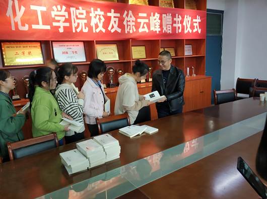 徐云峰向beat365在线唯一官网登录师生和学校图书馆捐赠自己近两年出版的散文随笔集《云在天上飞》和《心路一光年》共1000余册。