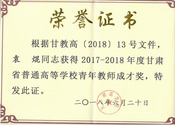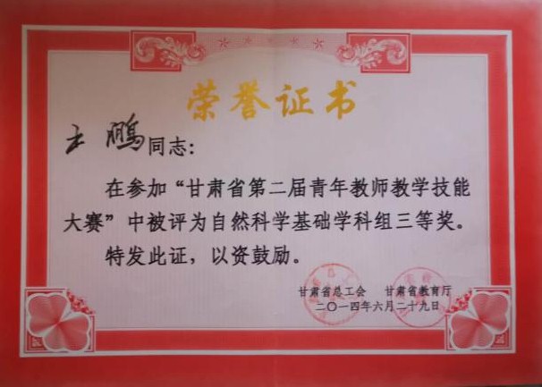 近年来,学院在新进青年教师中实施“青年教师培养导师制”,使青年教师尽快熟悉教学过程,成长为教学能手。鼓励年轻教师攻读博士学位,十三五期间,共引进博士13人,4位教师获评正高级职称,2位教师获评副高职称,3位教师攻读博士学位。1人入选教育部“新世纪人才”,2人被聘为甘肃省“青年飞天学者”,1人入选甘肃省领军人才,1人荣获甘肃省园丁奖,5人荣获甘肃省高等学校青年教师成才奖,9人入选beat365“青蓝人才工程”。1位教师获天水师院“四有”好老师,11位教师荣获天水师院“三育人”先进个人,2位教师获天水师范学院第三届教学优秀奖。在校级“微课竞赛”中,1位教师荣获一等奖,1位老师荣获二等奖。