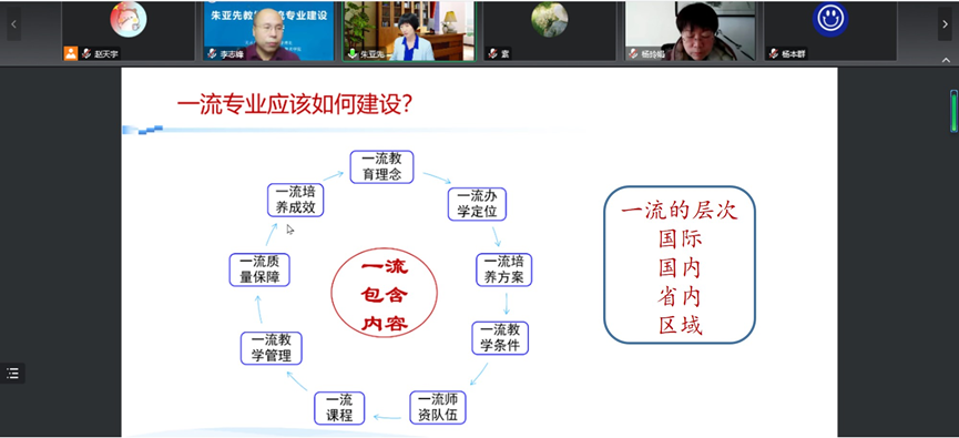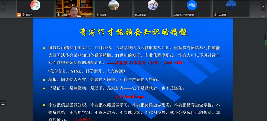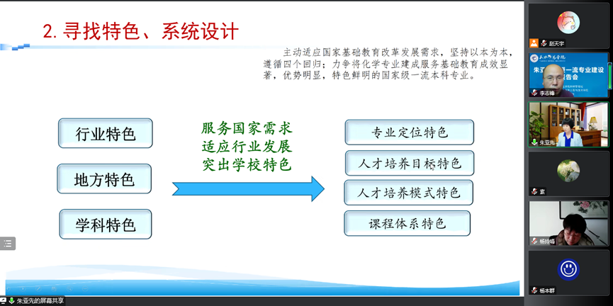 为进一步加强化学专业内涵建设,切实提高人才培养质量,近日,beat365在线唯一官网登录线上举行化学类一流本科专业建设交流会。会议特别邀请教育部高等学校化学类专业教学指导委员会秘书长、厦门大学朱亚先教授及《化学教育》专职副主编、北京师范大学朱玉军博士就化学一流专业建设进行指导,会议围绕化学一流专业建设的重点和建议及化学类专业怎么做教学研究、如何撰写教学研究论文展开。学院化学、应用化学和化工系相关教师及学生共计300余人参加交流会。